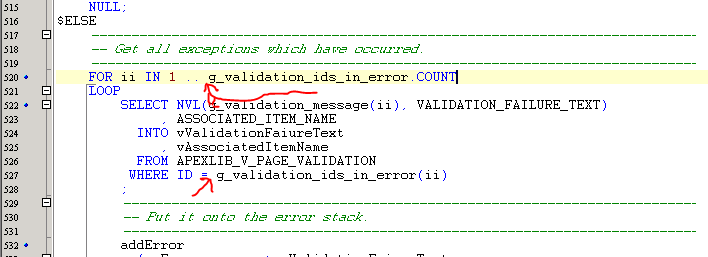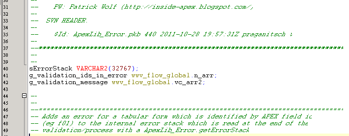 Then go and replace all the references to these types (they will be like "wwv_flows.g_validation_ids_in_error and wwv_flows.g_validation_message) - simply remove the schema reference wwv_flows. A few snippets how does it look like: